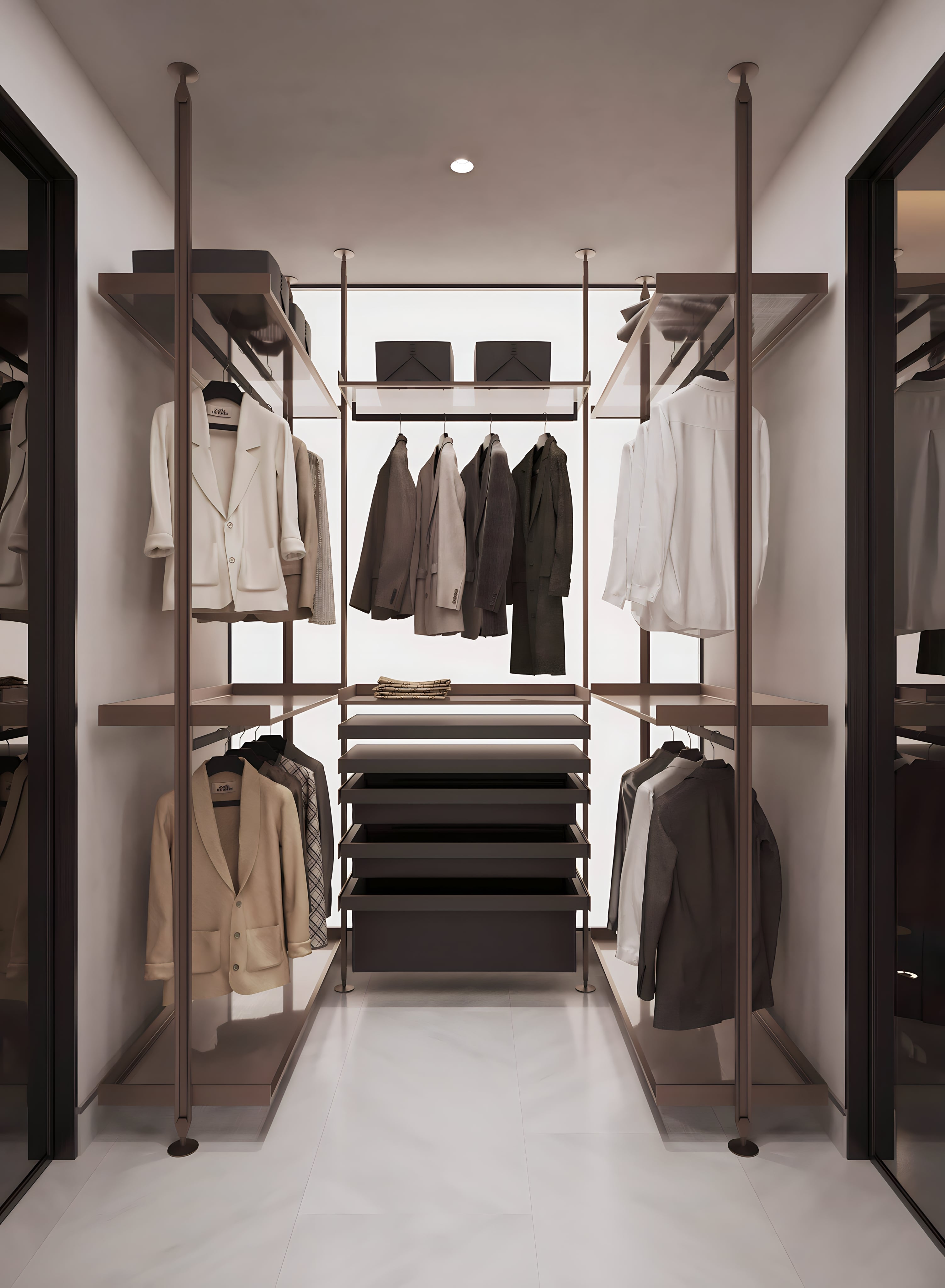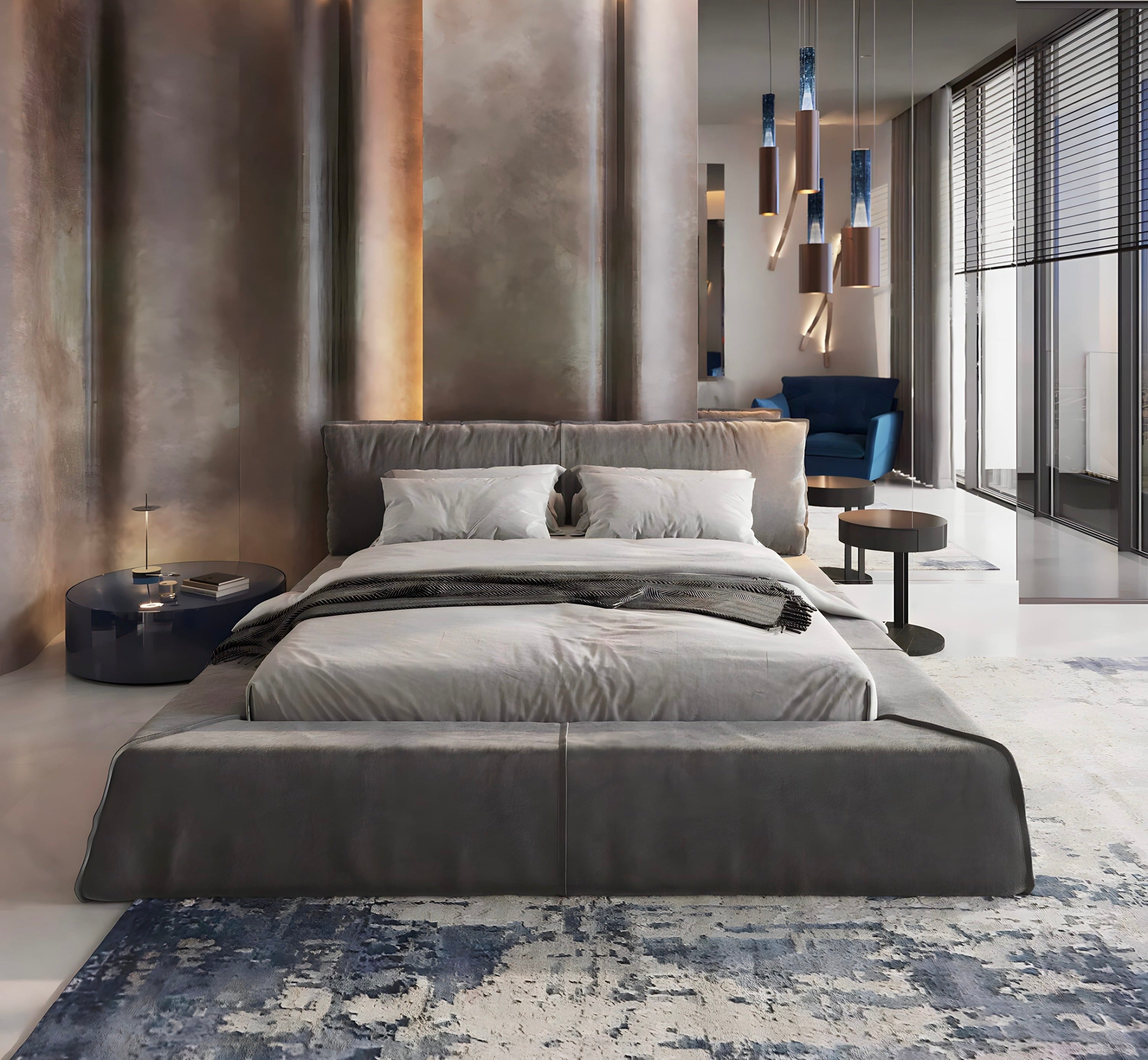 The leather bed with an extended headboard is a master piece of the bedroom, adding elegance. Iconic Minotti bedside tables complete the composition.