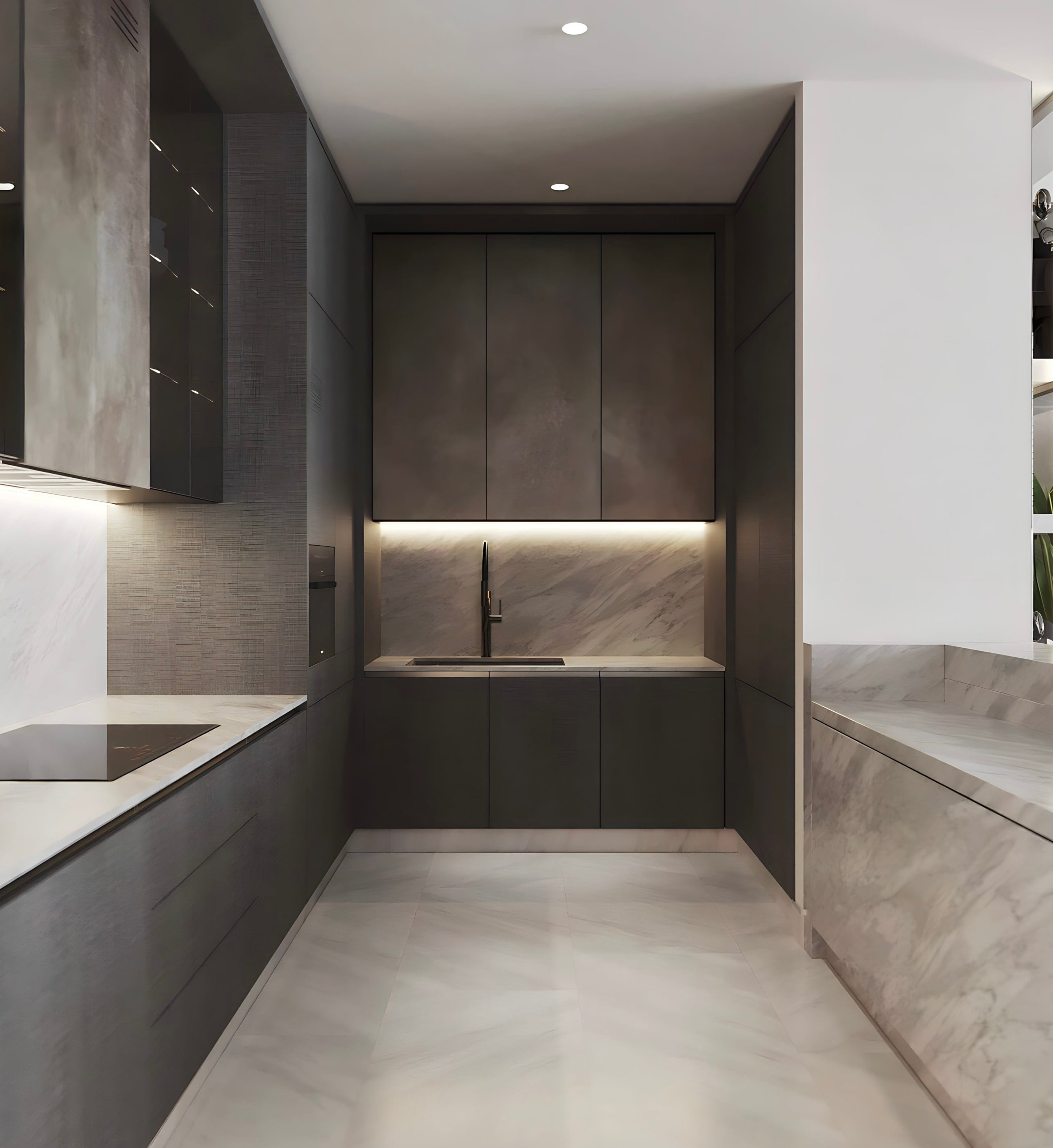The kitchen was designed to be functional on all levels, including materials and storage possibilities. The quartz apron match the dynamic floor design.
