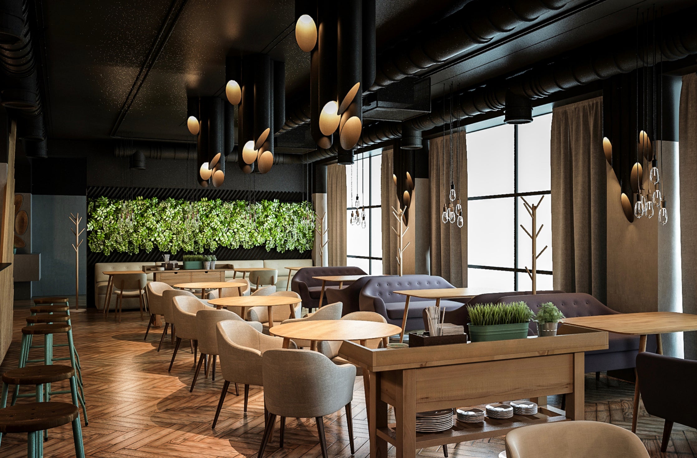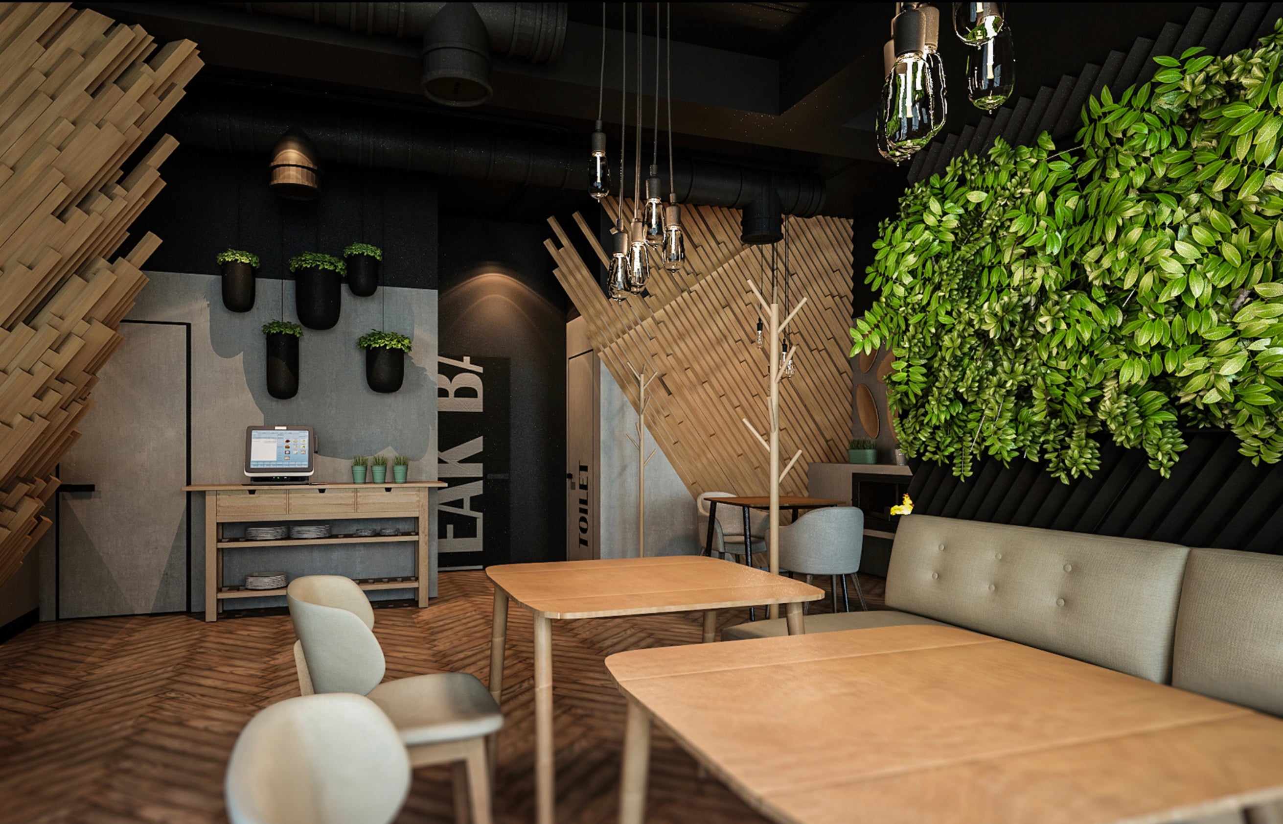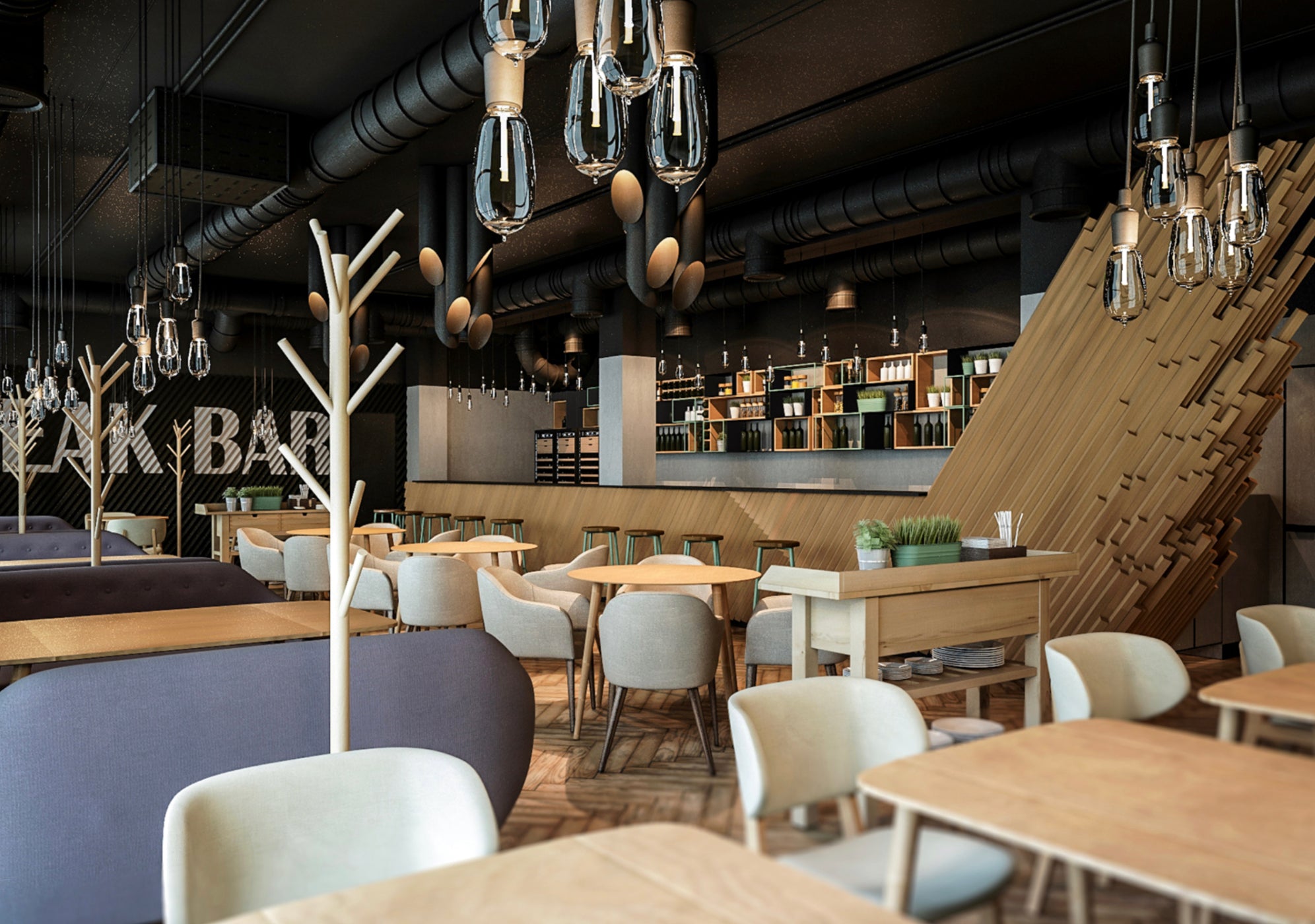 It's a steak bar with a casual style similar to typical American places. It is about the harmonious blend of old and new, about combining different materials and textures into a proportionate design idea.