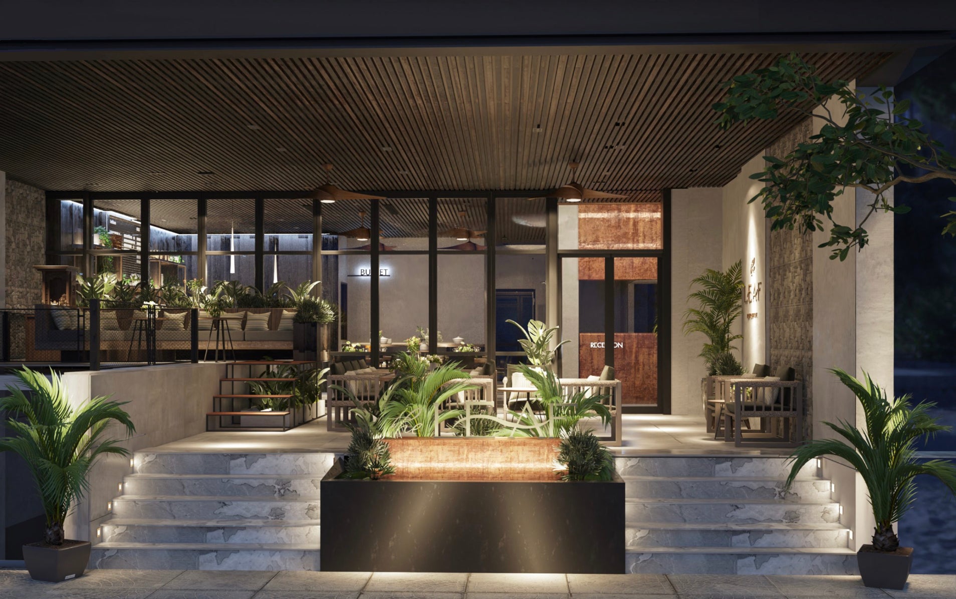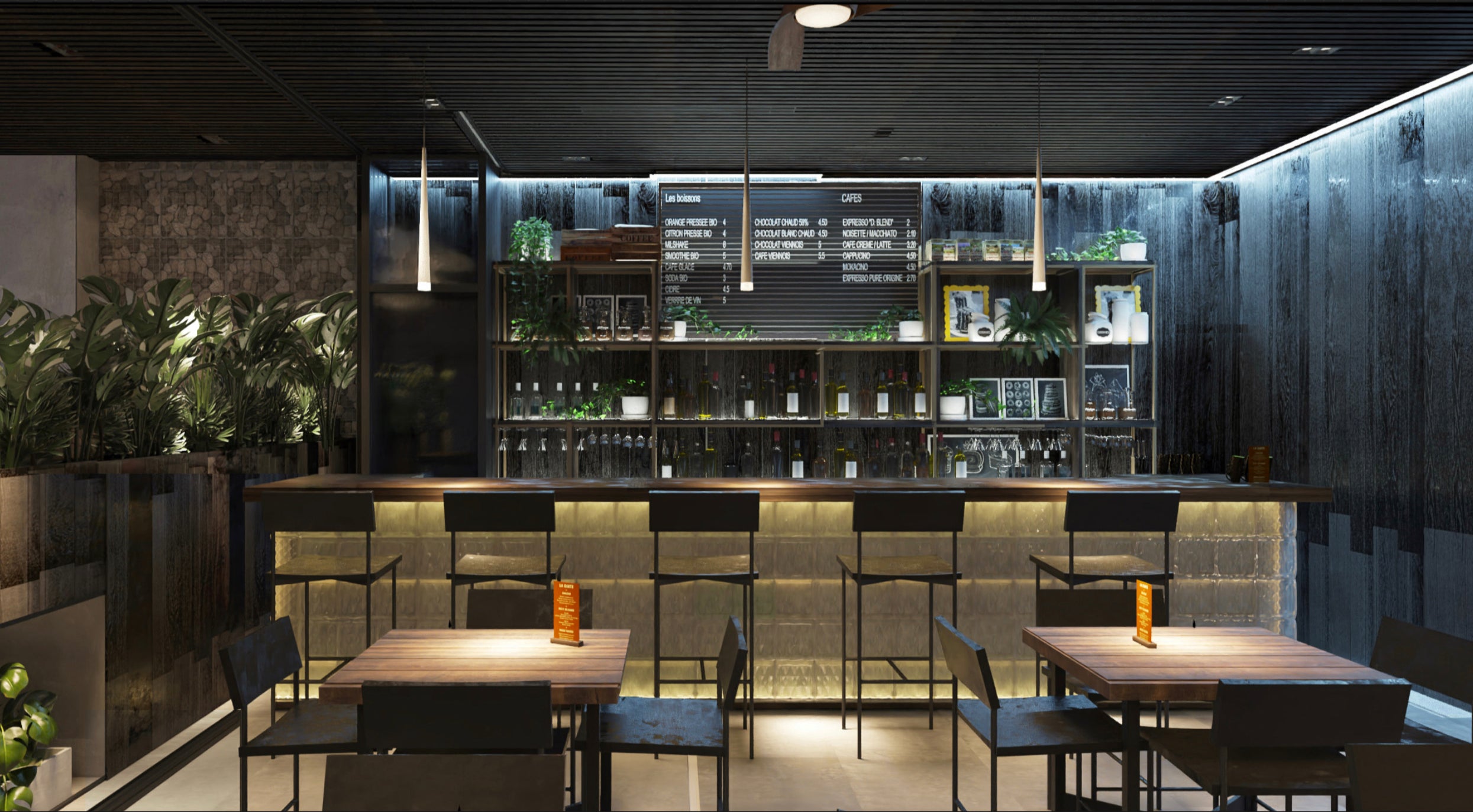 The interior and exterior of the restaurant are visually linked, and numerous green plants provide a unique environment by exposing their trunks in every aspect of the restaurant.The restaurant is roughly divided into two parts; the entrance area is welcoming, and the dining space has an intimate ambience.