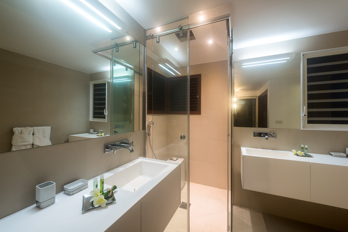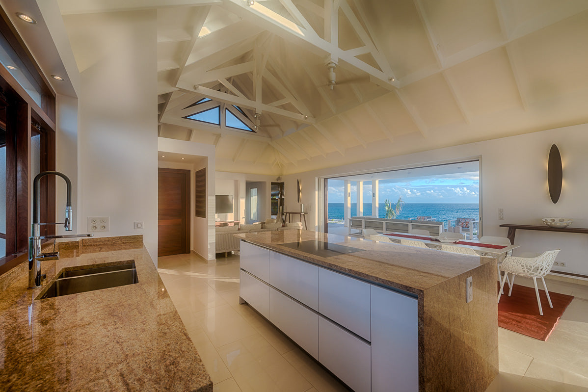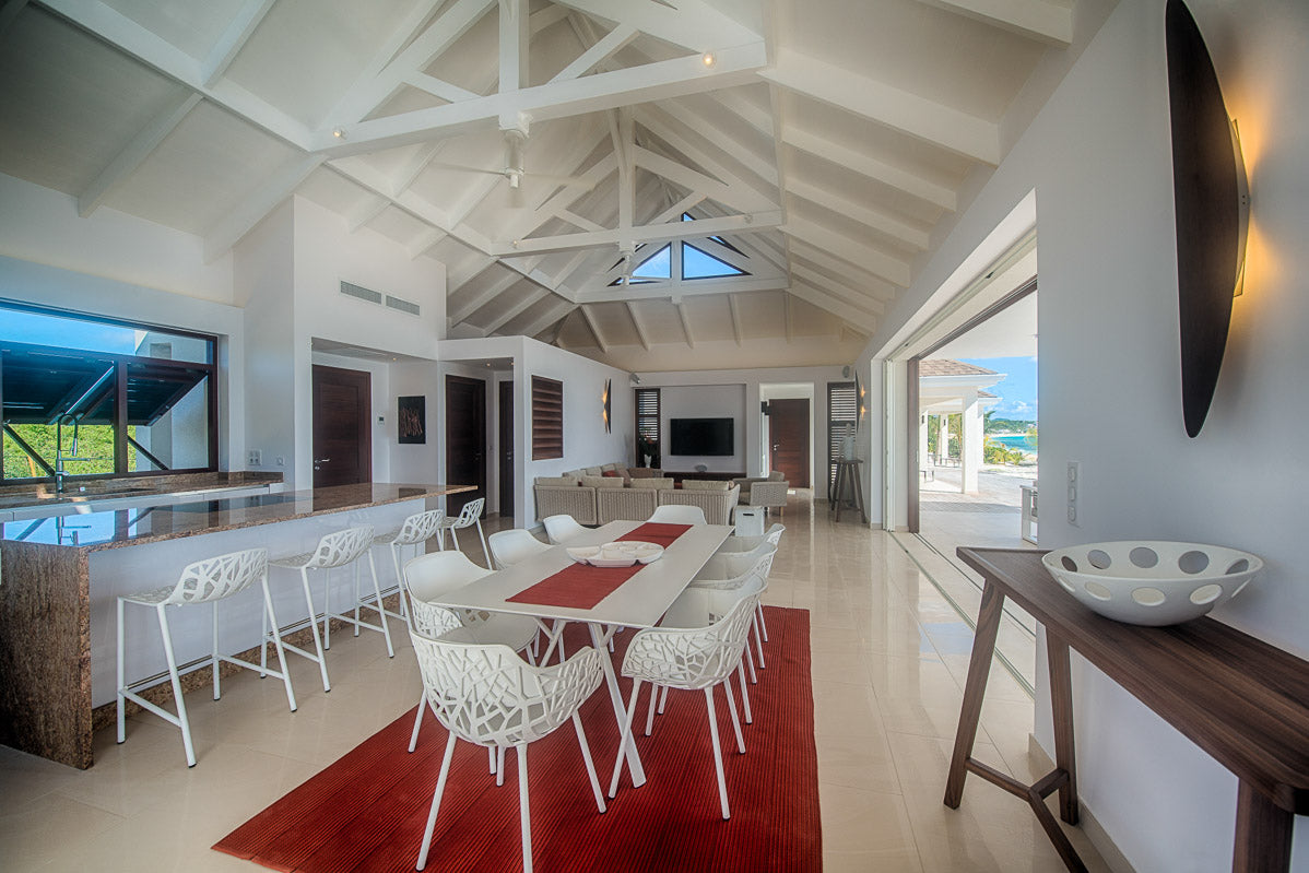 The open-plan interiors harmoniously blend with the exteriors. The look is elegantly sleek yet comfortable; a beautiful mix of contemporary style with elegant old-world Caribbean touches like the handcrafted shuttered doors and windows.