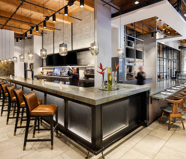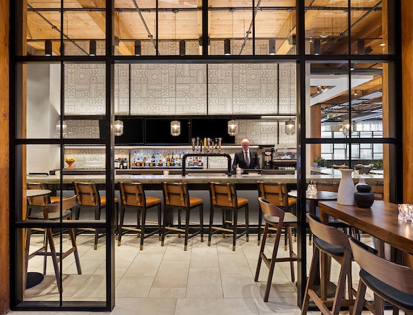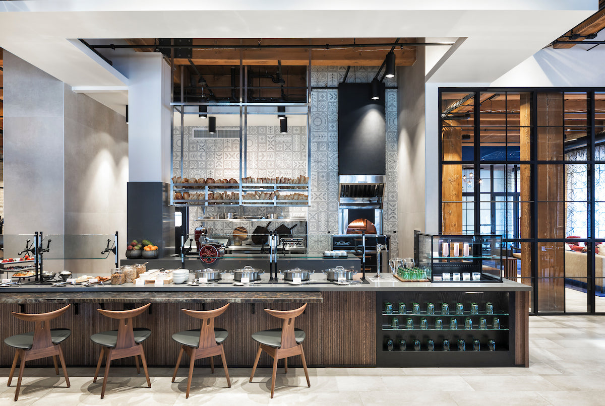 To achieve this unique atmosphere, designers chose tabletops of natural wood, Nordic lighting, genuine leather sofas, natural stone, and wooden seats and chairs. Wood also frames all of the restaurant's columns and serves as the primary decorative element in window design and the ceiling; wood is everywhere!