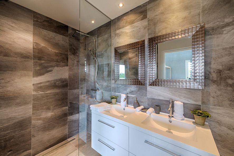 Spa-style bathrooms, in taupe and creamy tones, have walk-in showers and designer accessories. One has an outdoor garden shower.