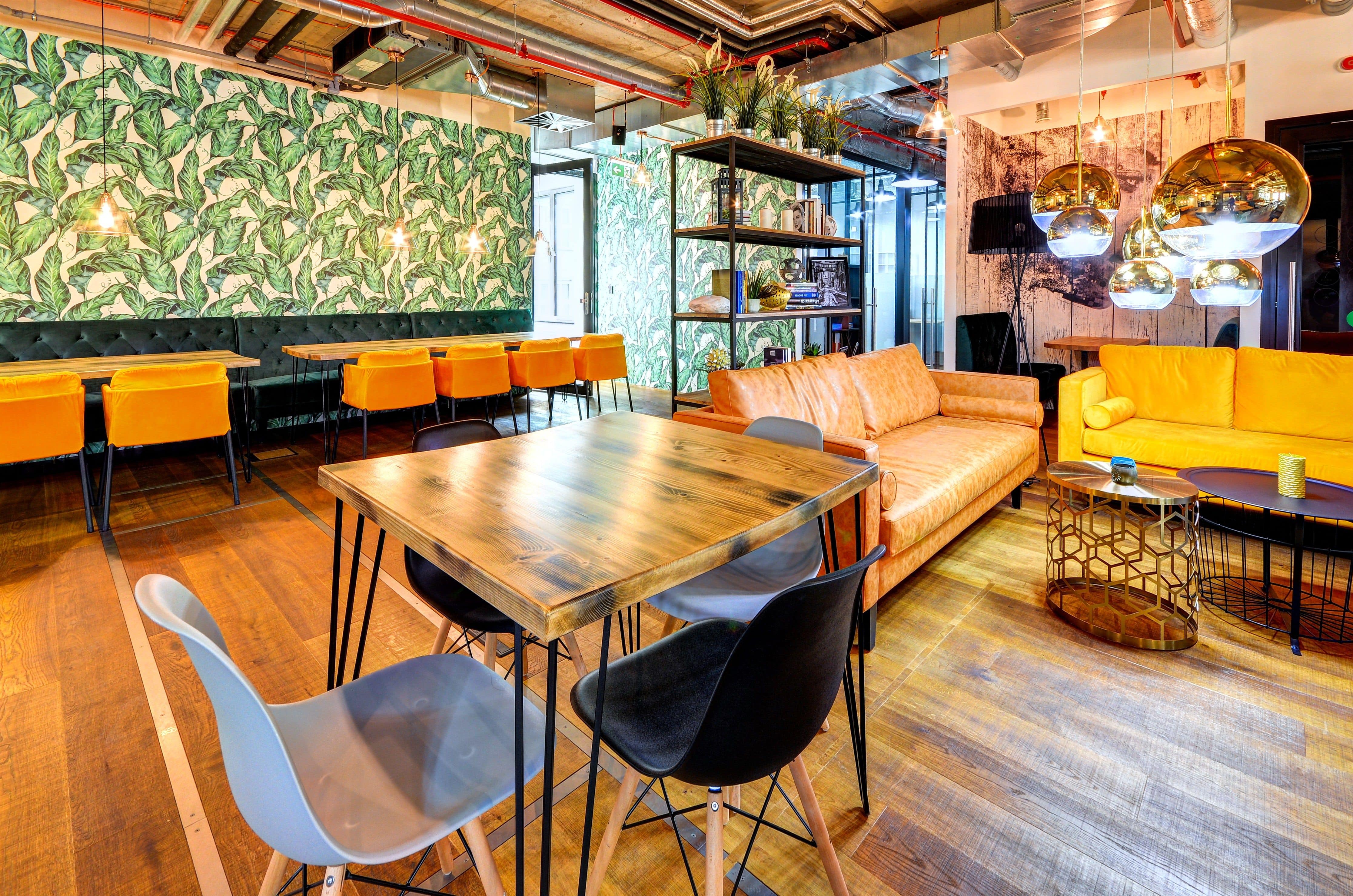 The lounge is set up using an open space design with a temporary working (hot desk) area.