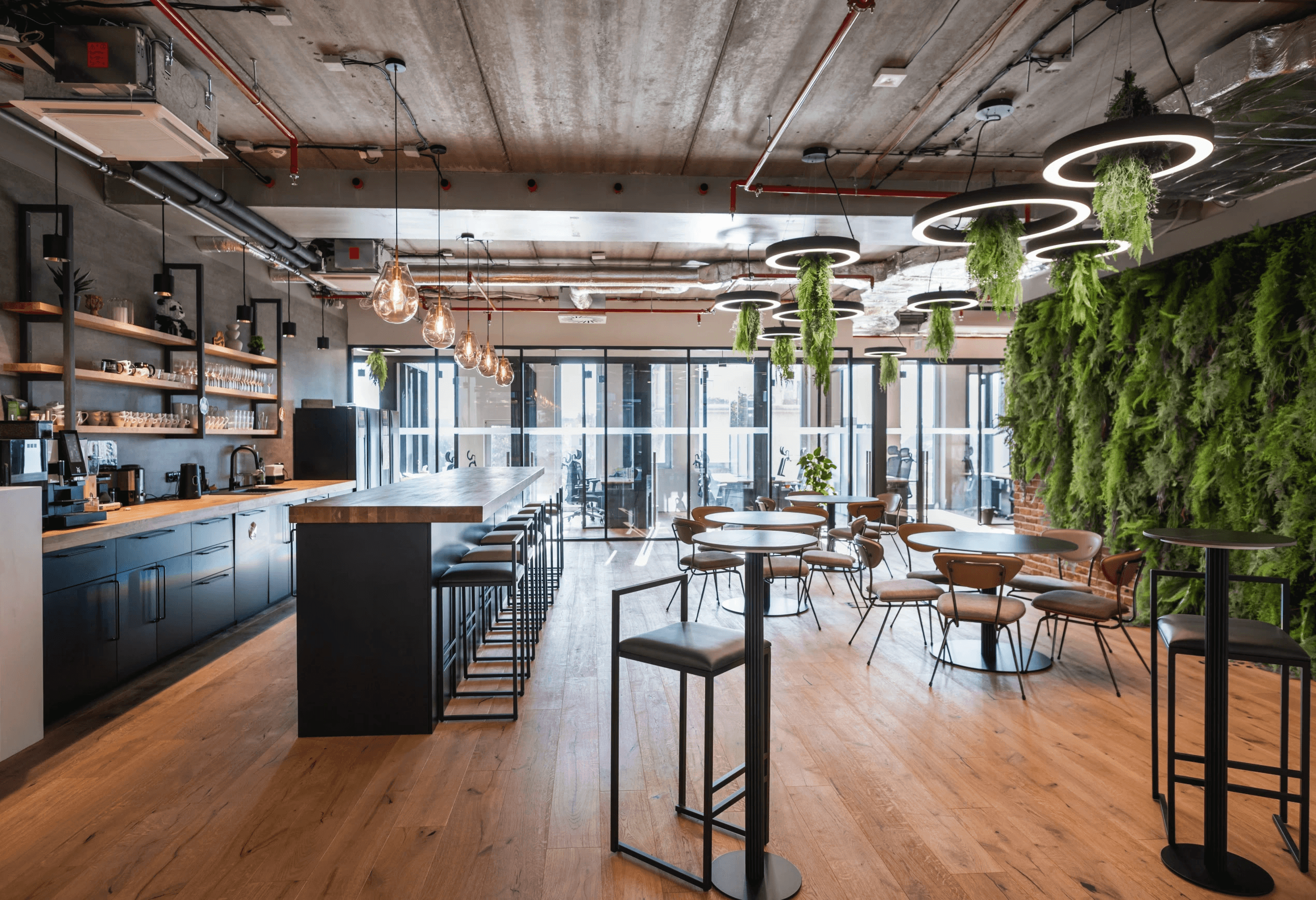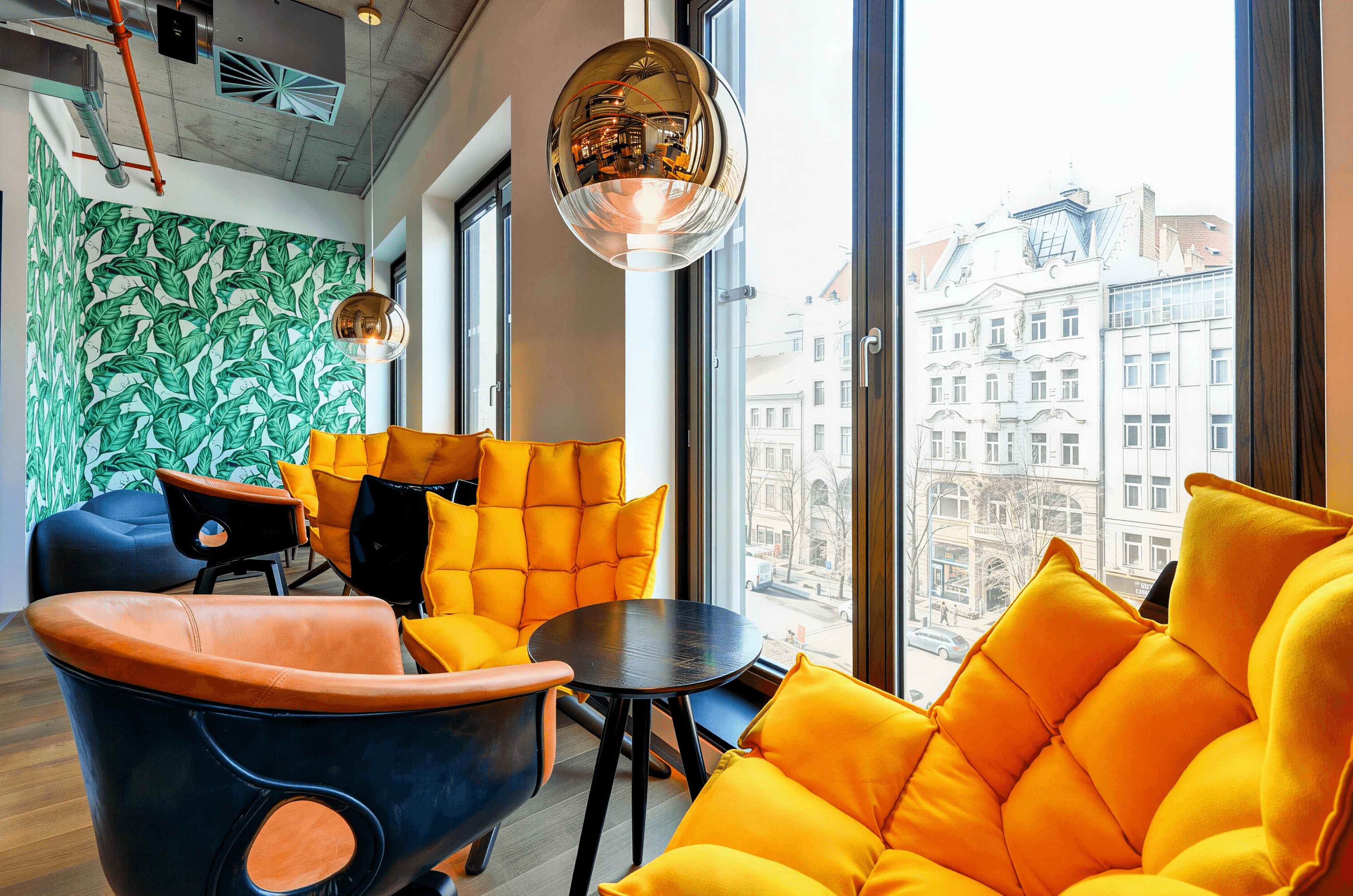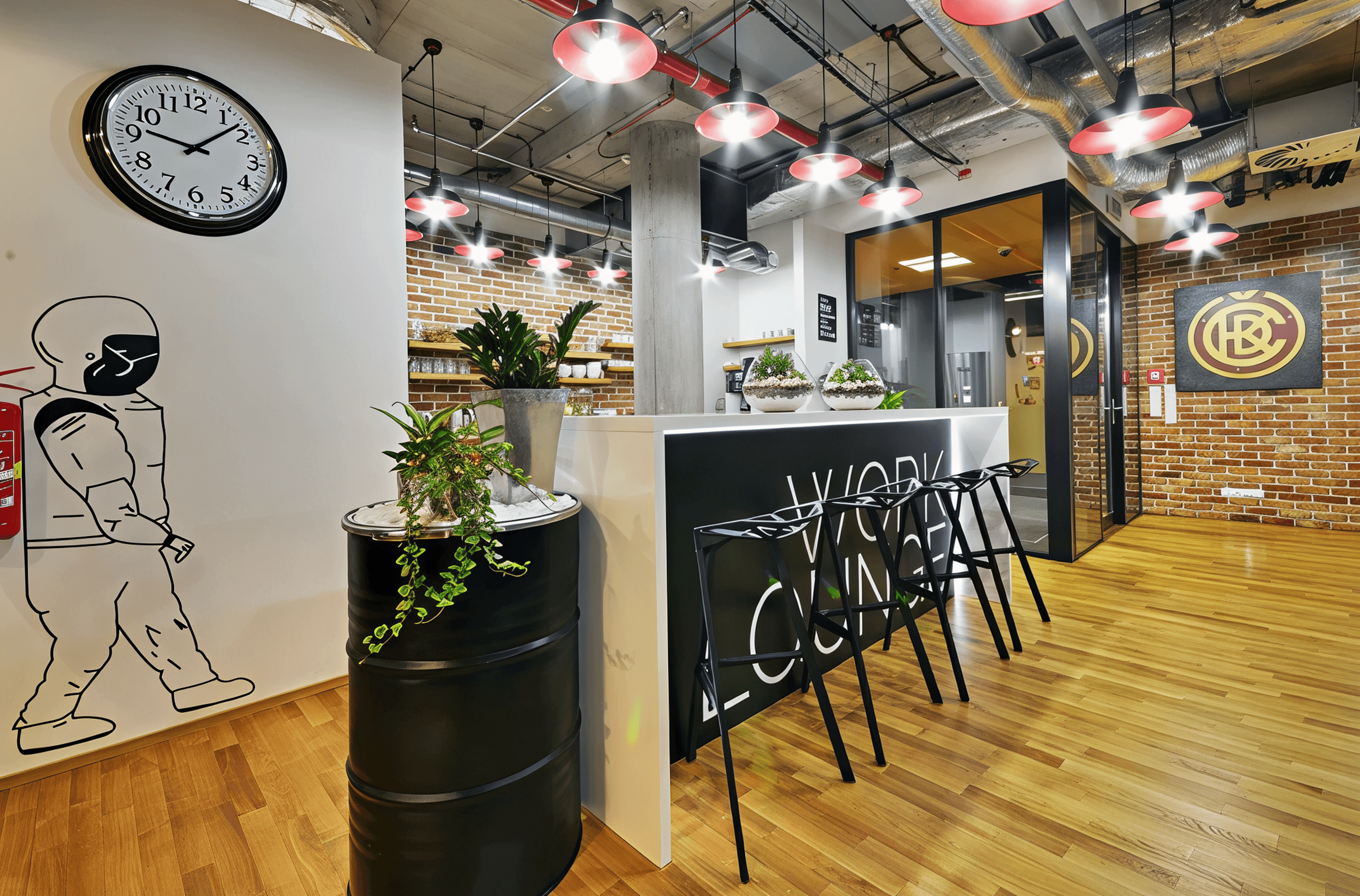 As co-founder, we developed the concept from the ground up: brand identity, spatial language, interior standards, economics, and supplier structure. The industrial-inspired design blends raw finishes, leather, wood, metal, brick, and concrete with bold colors and designer furniture. The central lounge became the heart of each location — a social engine designed to foster connection, creativity, and energy.